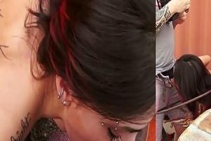 Канадский татуированная брюнетка стоит на коленях на полу и сосала жирного мяса палку, как профи